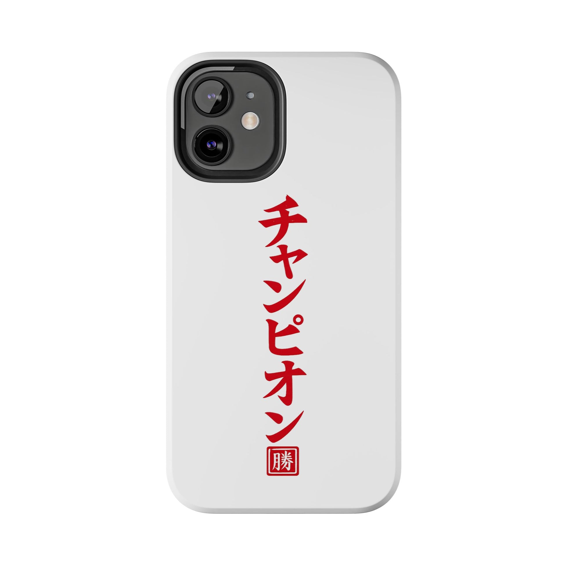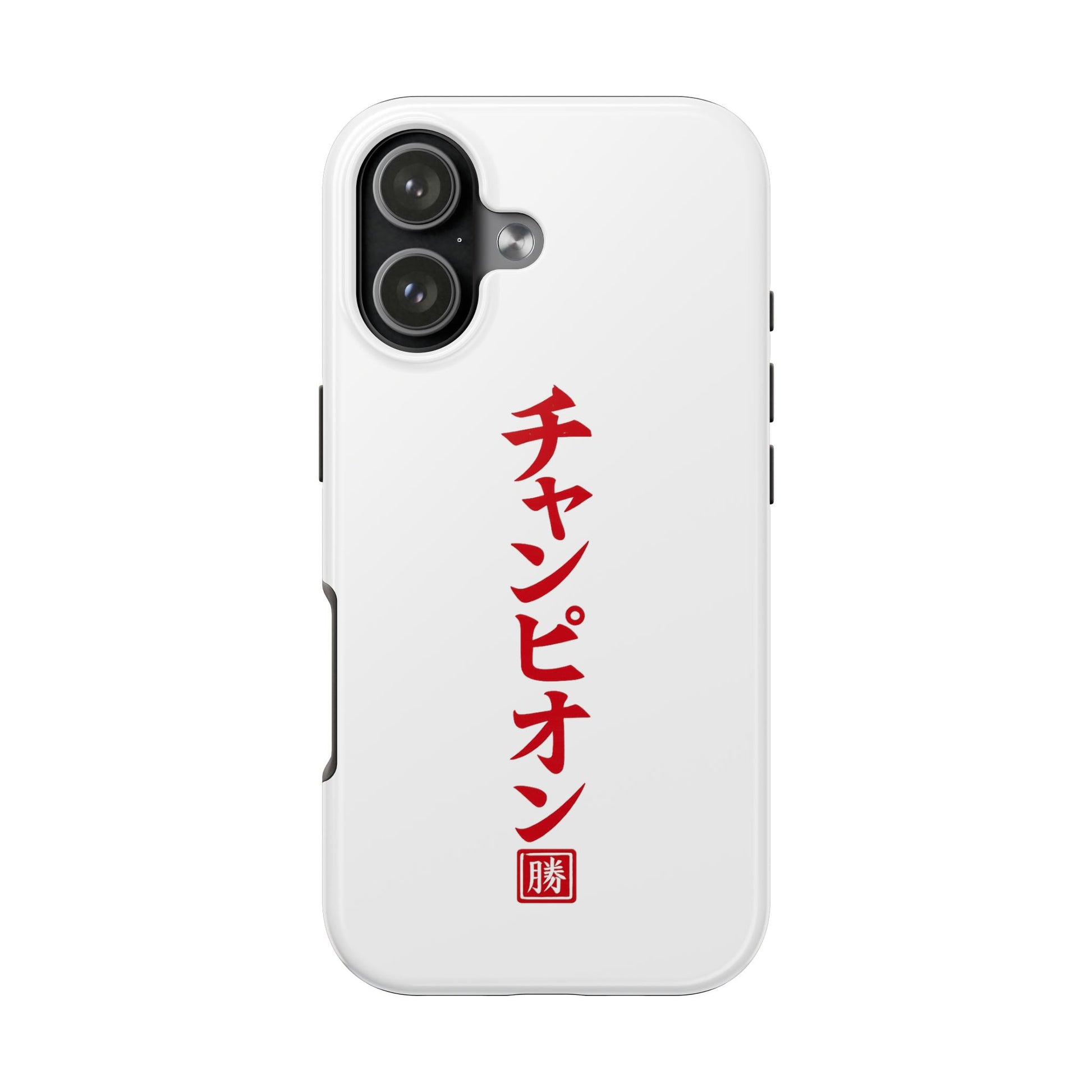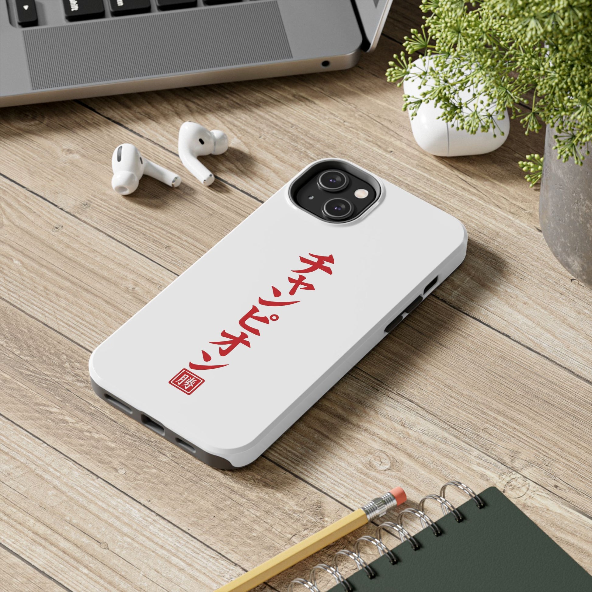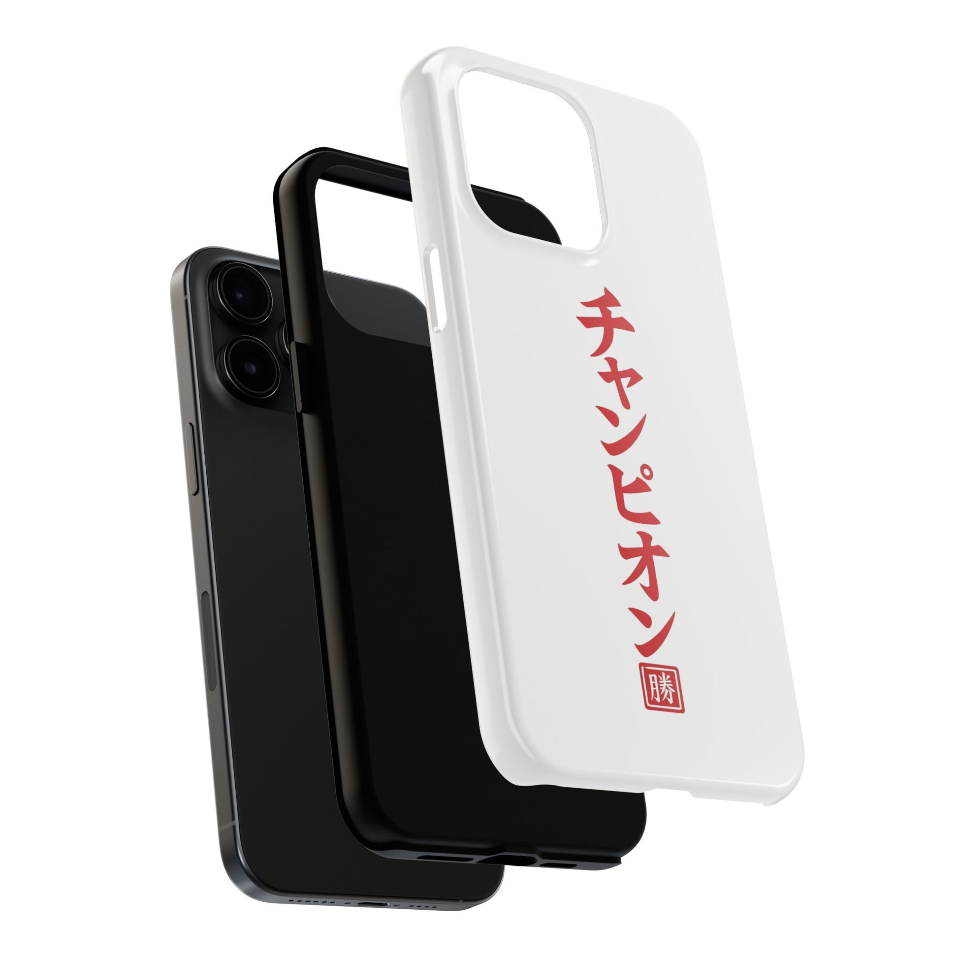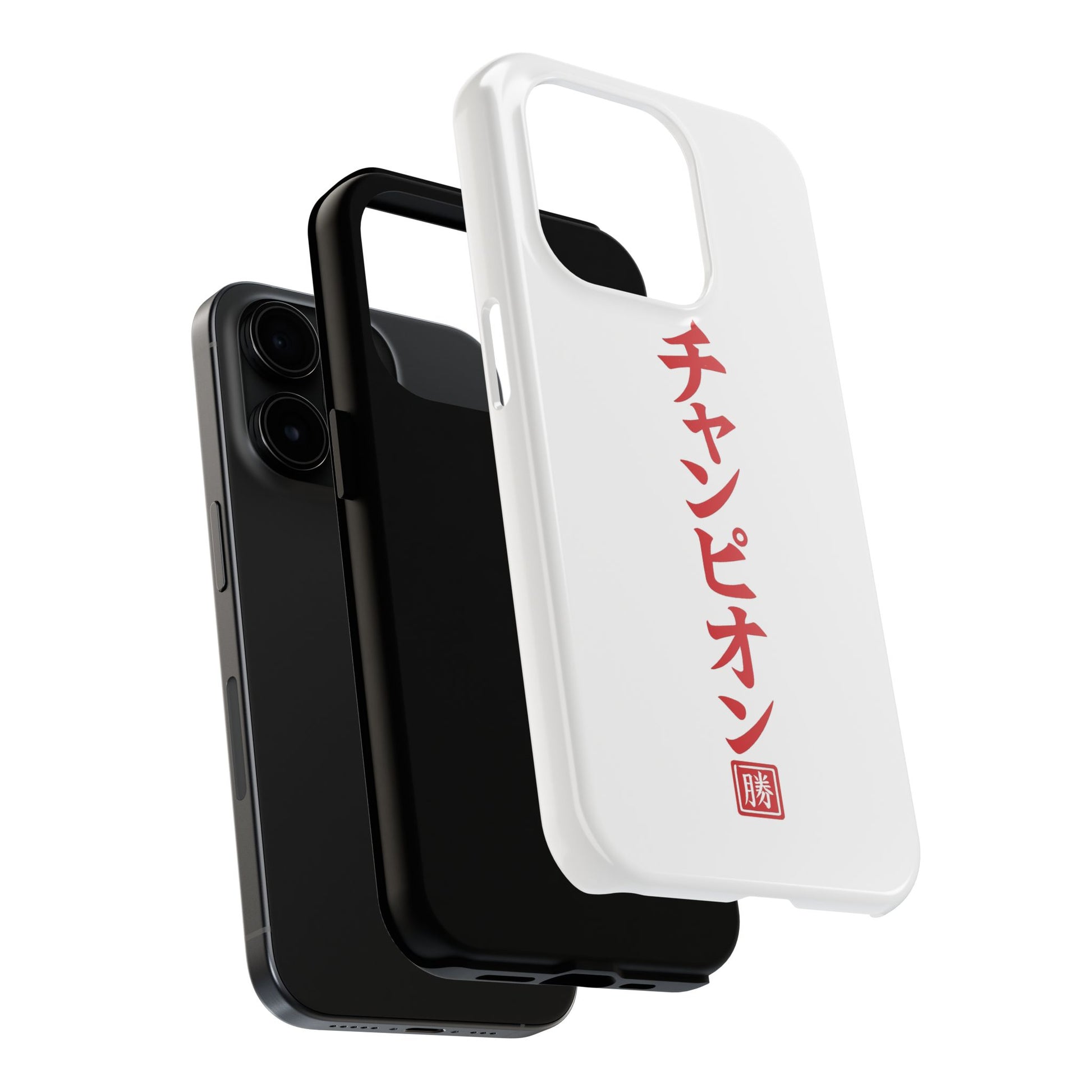A sleek, protective phone case that blends minimalist style with resilient engineering. The white glossy shell features bold red vertical Japanese calligraphy that reads “champion,” plus a small red stamp mark for an authentic, martial-arts-inspired look. Lightweight but sturdy, the two-piece polycarbonate shell and TPU liner absorb shocks and disperse impact while a lay-flat bezel keeps the screen raised from flat surfaces. UV-resistant coating preserves the bright white background and crisp red print outdoors. Designed for everyday wear — from commute to dojo — this case keeps your phone safe while making a confident visual statement.