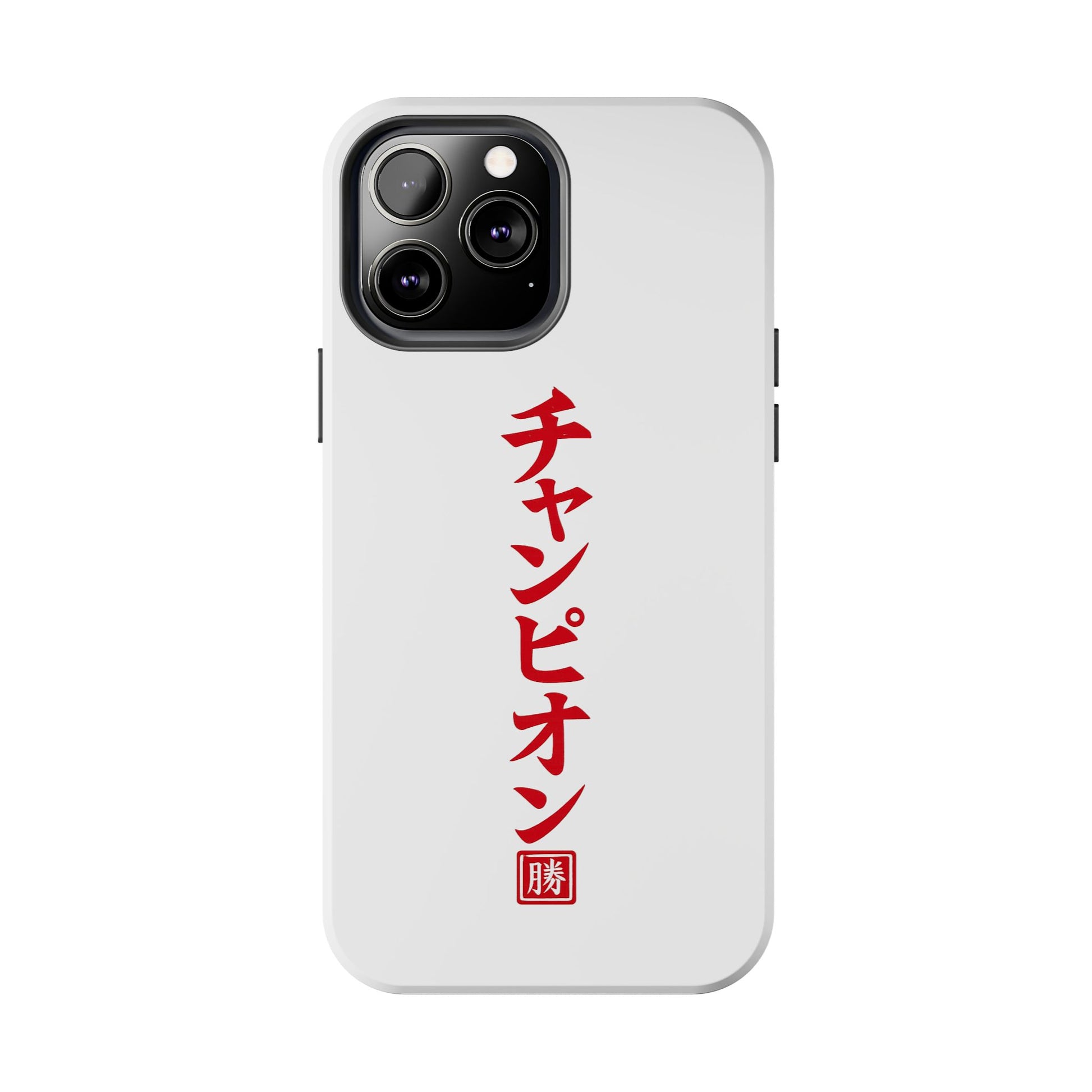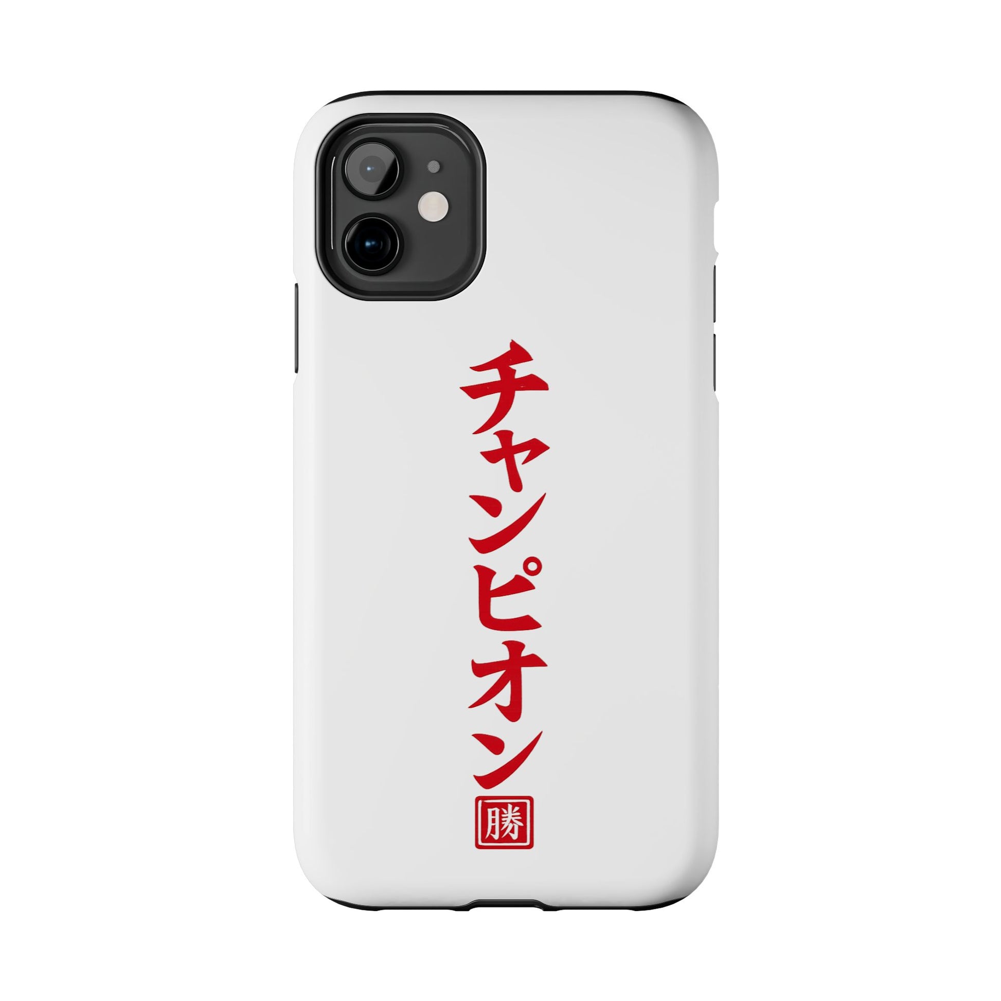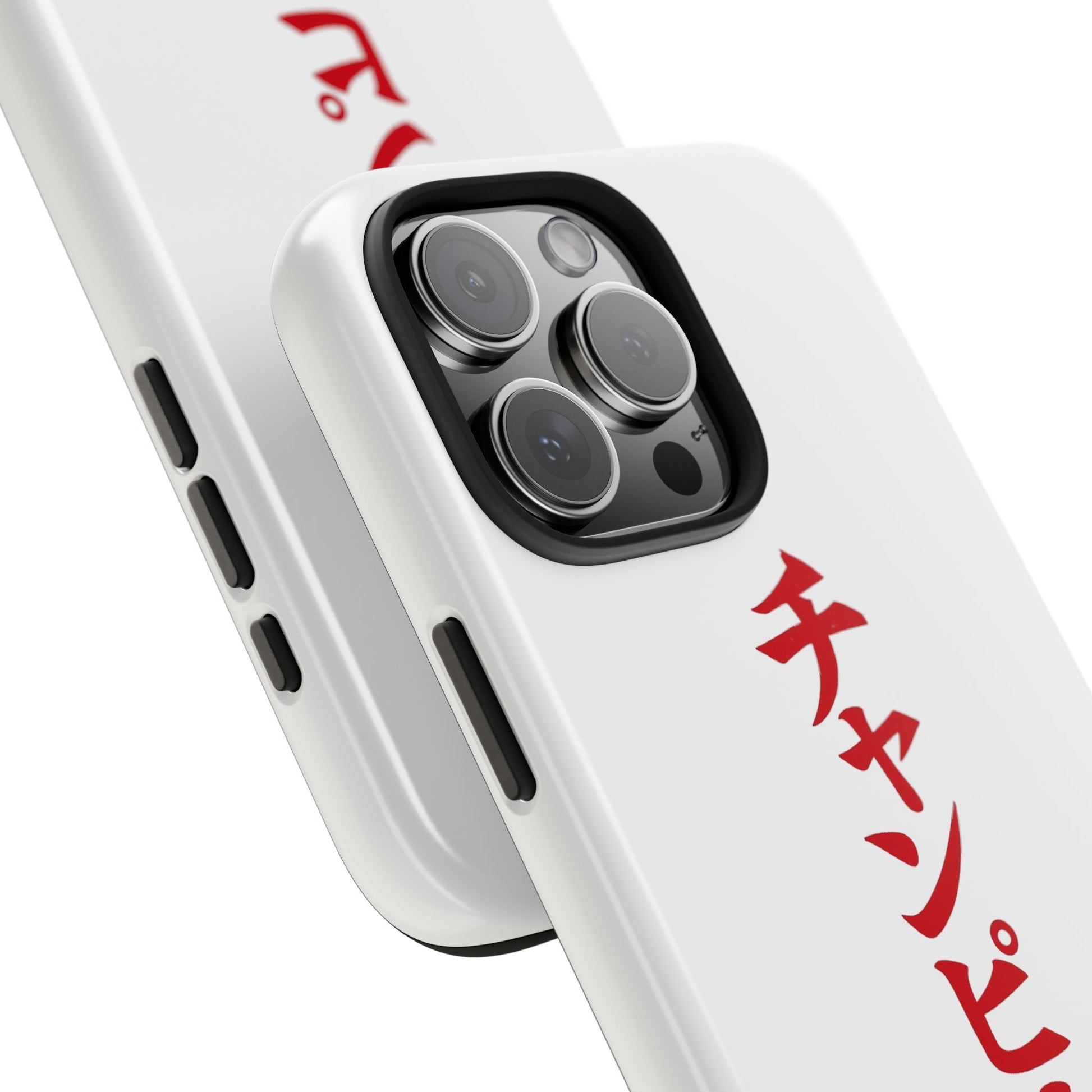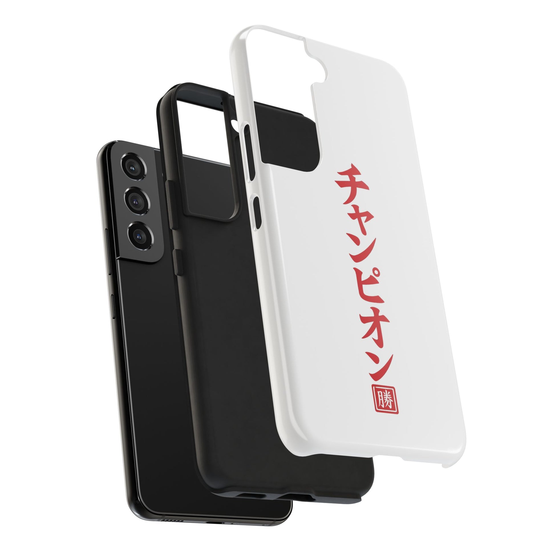 A sleek, protective phone case that blends minimalist style with resilient engineering. The white glossy shell features bold red vertical Japanese calligraphy that reads “champion,” plus a small red stamp mark for an authentic, martial-arts-inspired look. Lightweight but sturdy, the two-piece polycarbonate shell and TPU liner absorb shocks and disperse impact while a lay-flat bezel keeps the screen raised from flat surfaces. UV-resistant coating preserves the bright white background and crisp red print outdoors. Designed for everyday wear — from commute to dojo — this case keeps your phone safe while making a confident visual statement.