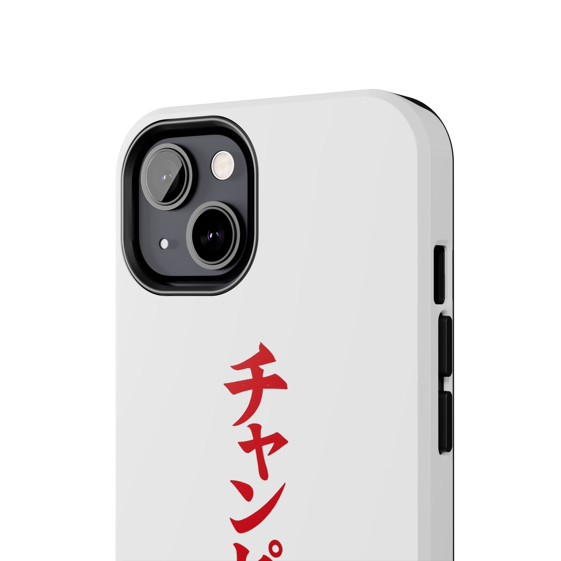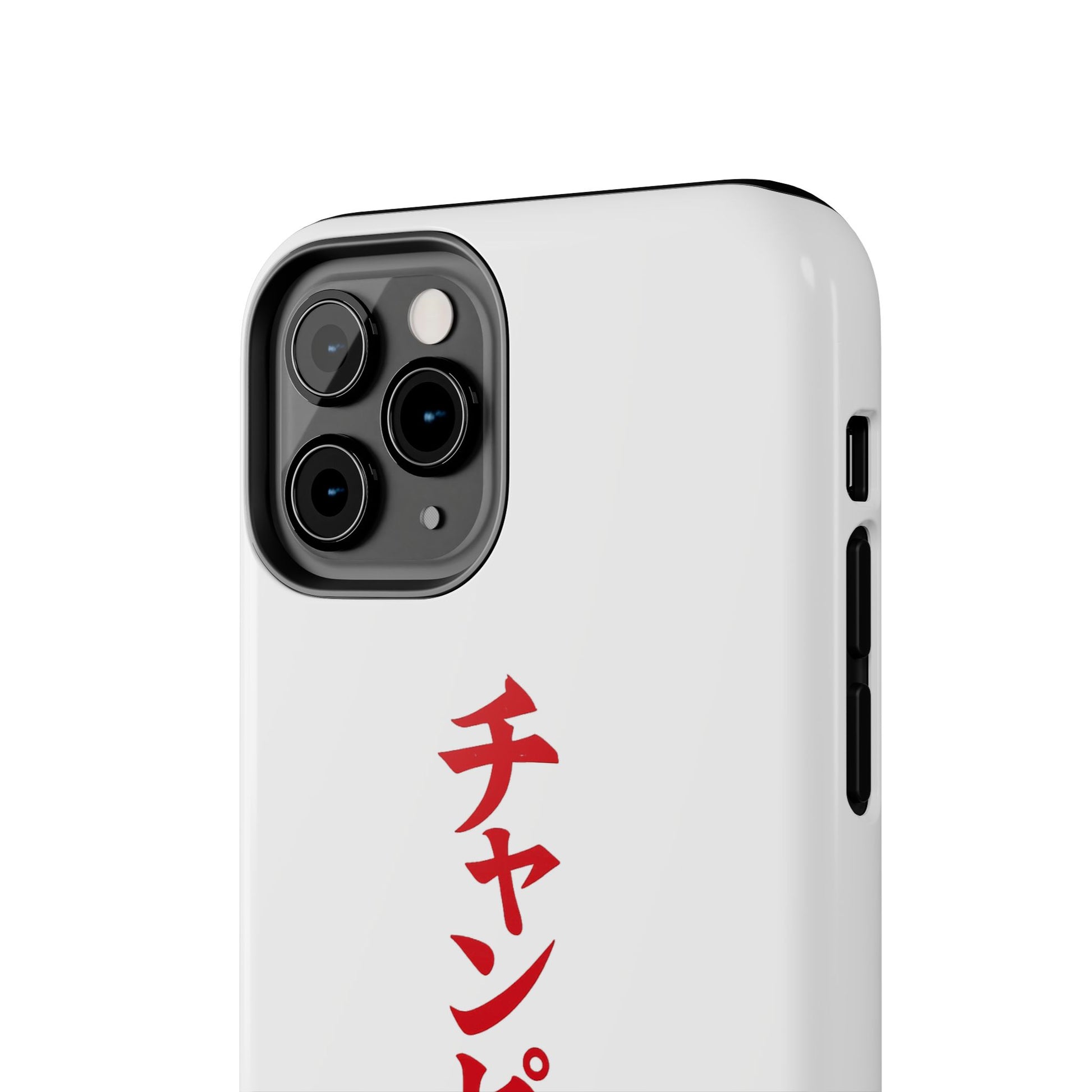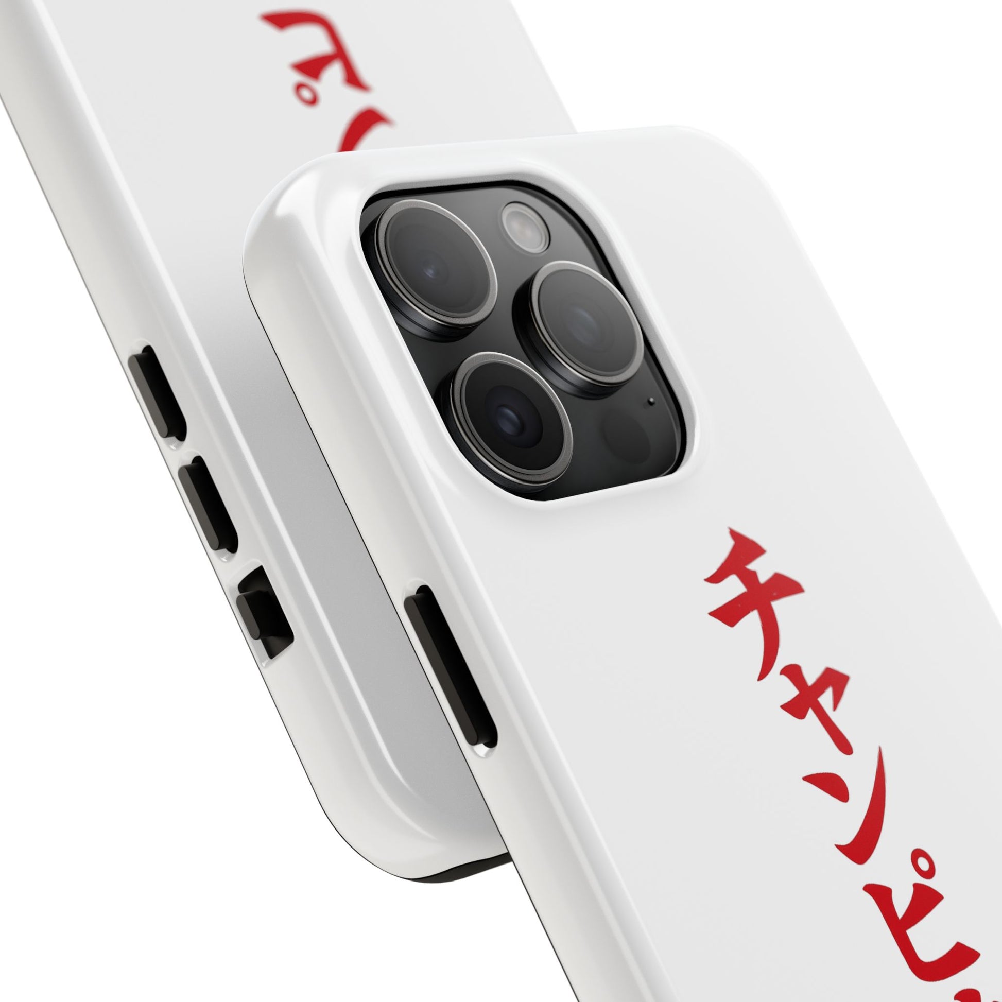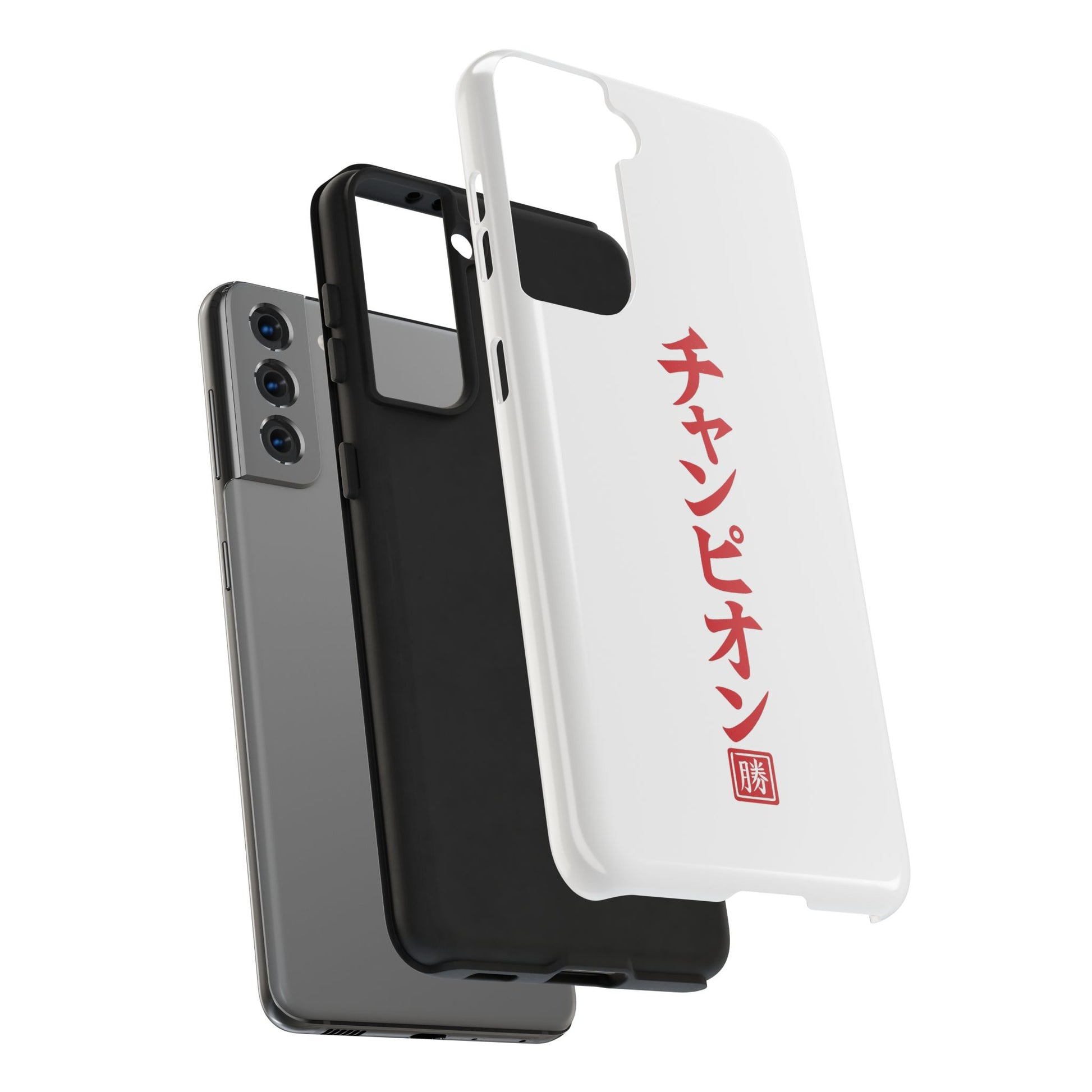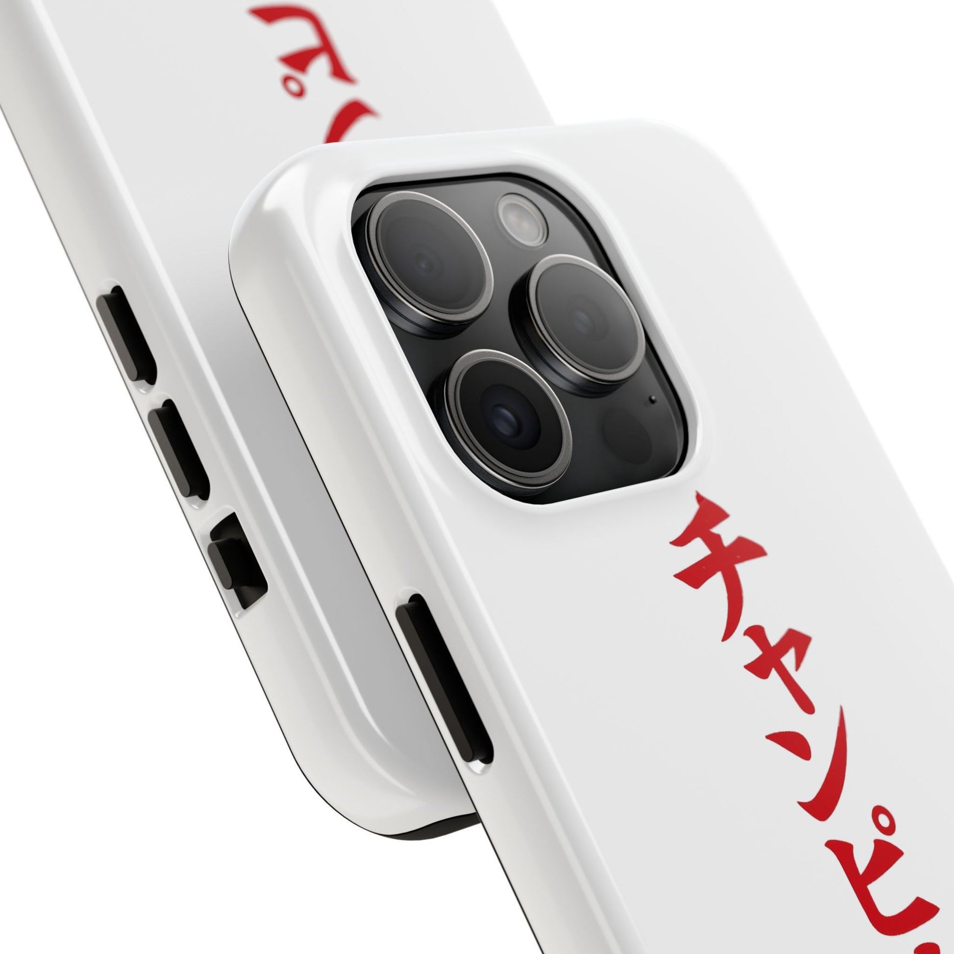 A sleek, protective phone case that blends minimalist style with resilient engineering. The white glossy shell features bold red vertical Japanese calligraphy that reads “champion,” plus a small red stamp mark for an authentic, martial-arts-inspired look. Lightweight but sturdy, the two-piece polycarbonate shell and TPU liner absorb shocks and disperse impact while a lay-flat bezel keeps the screen raised from flat surfaces. UV-resistant coating preserves the bright white background and crisp red print outdoors. Designed for everyday wear — from commute to dojo — this case keeps your phone safe while making a confident visual statement.