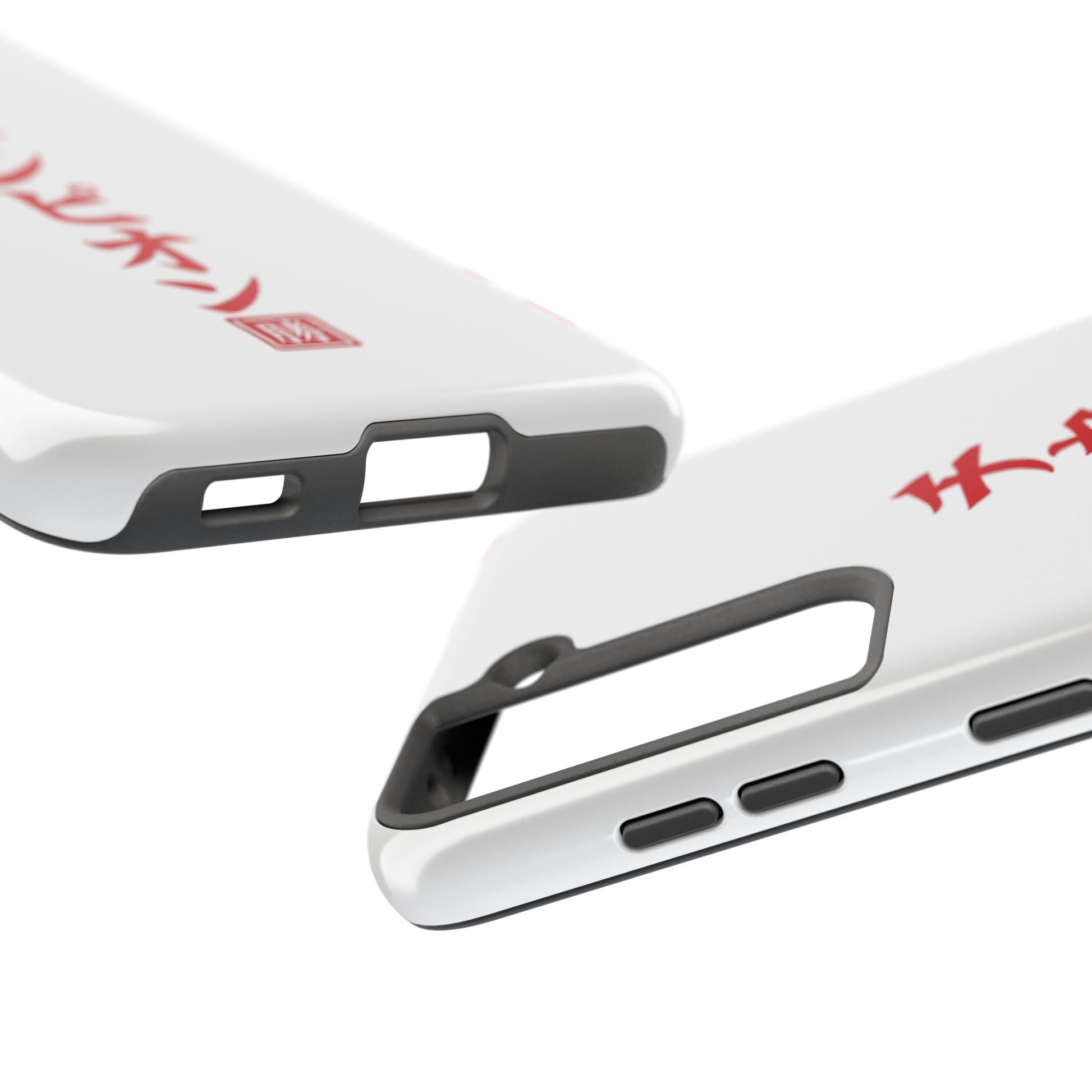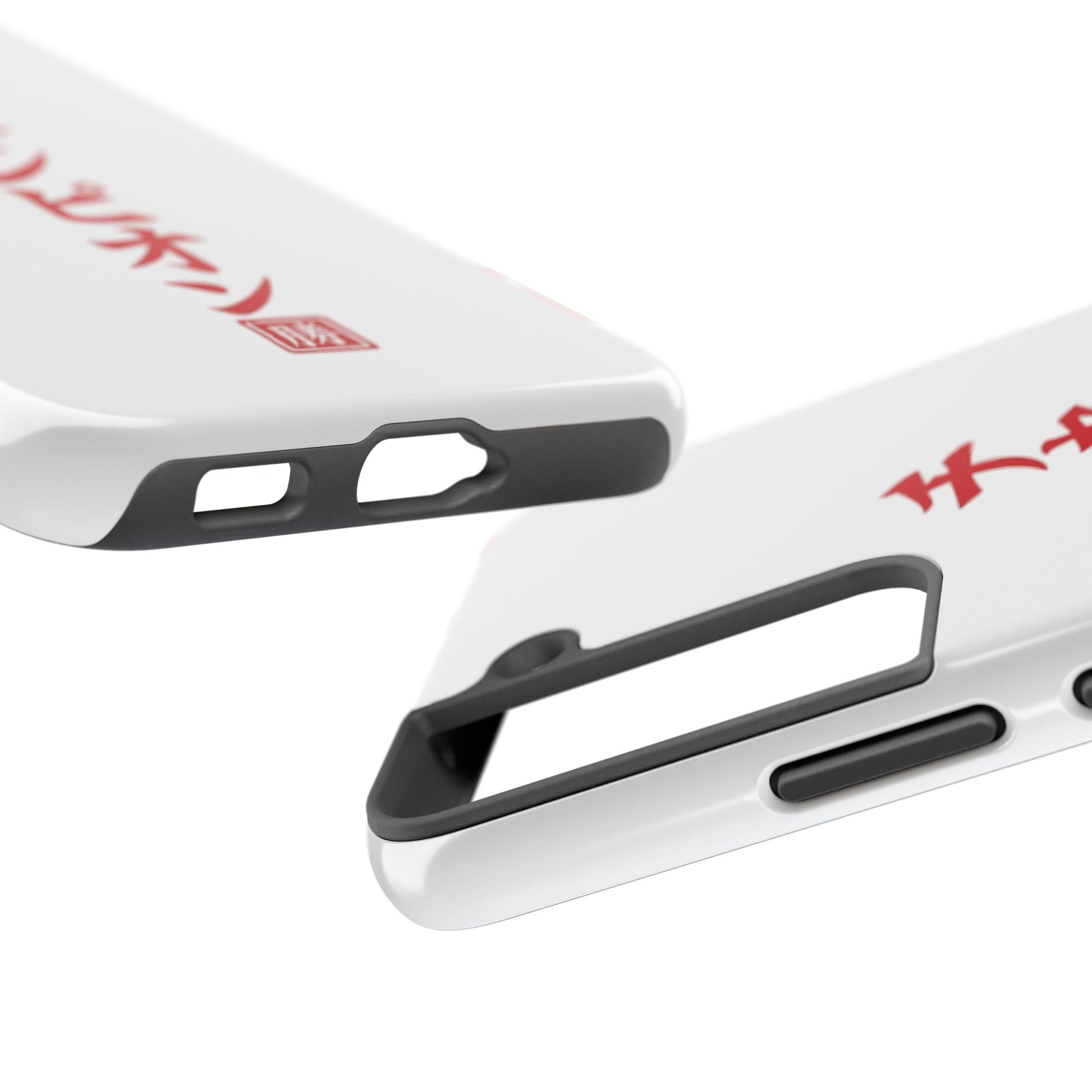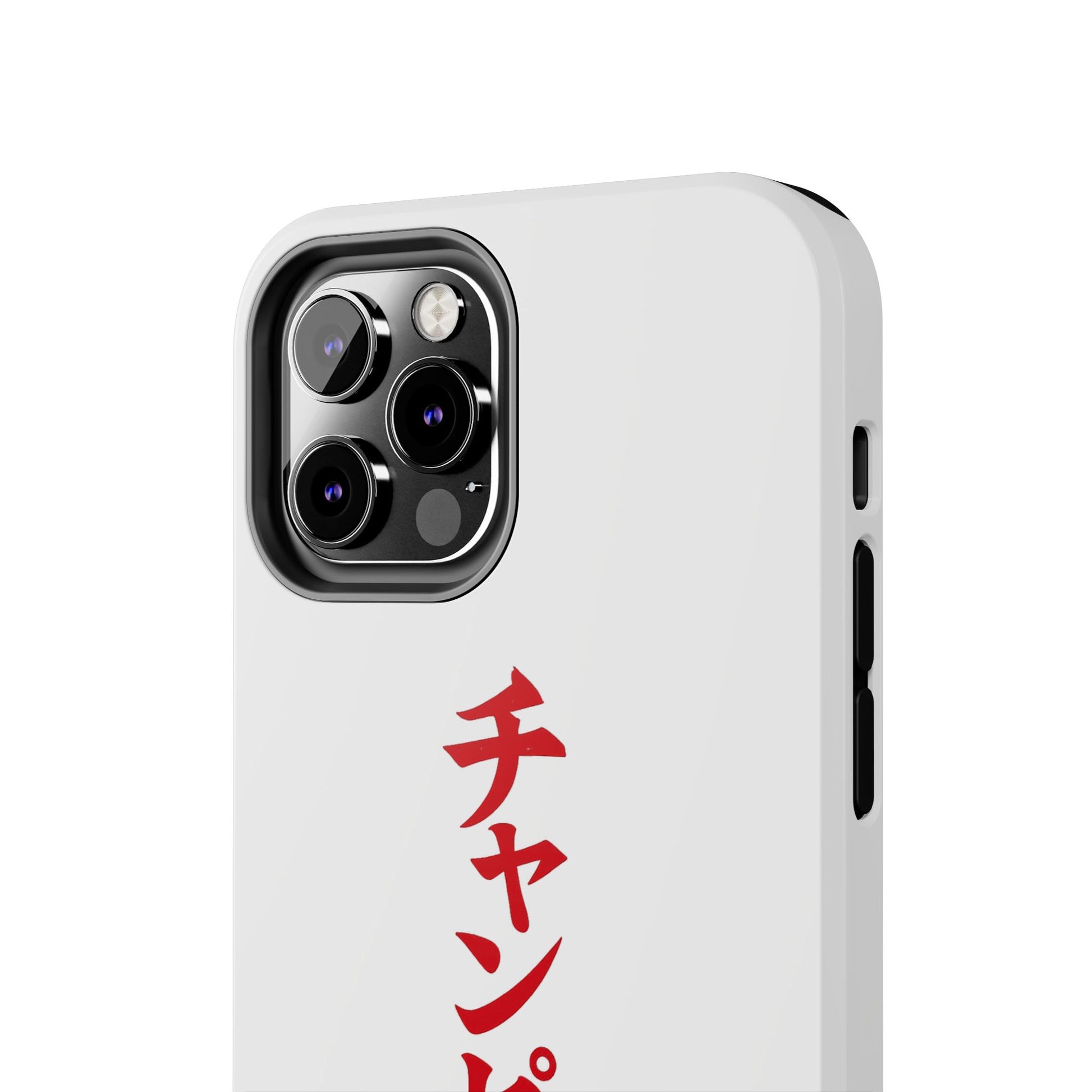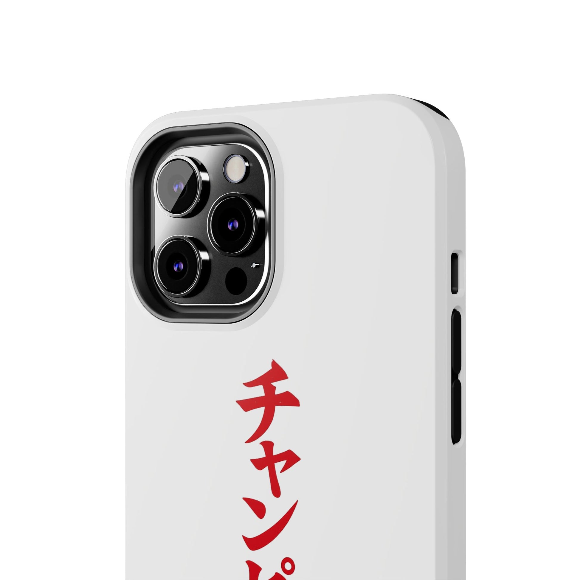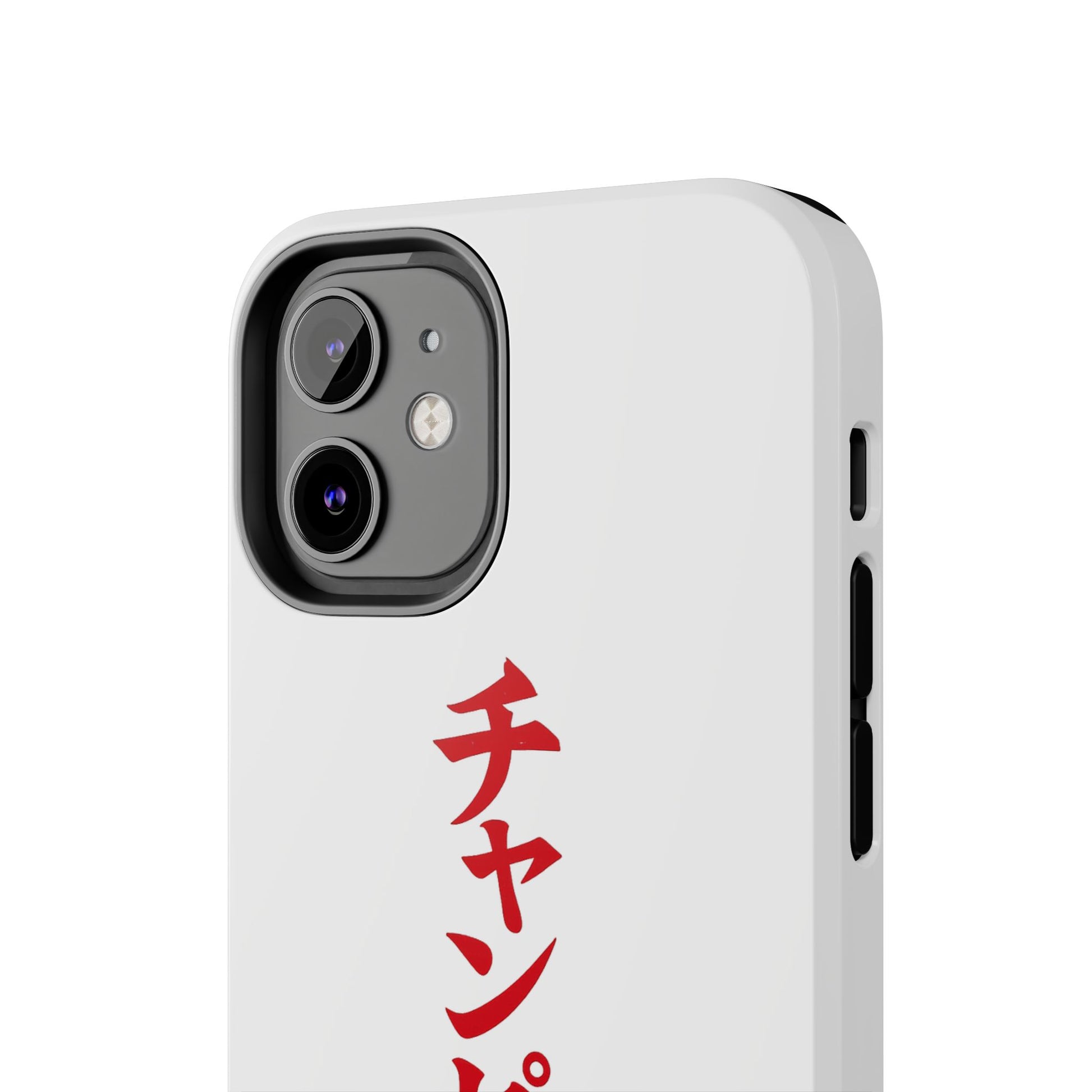 A sleek, protective phone case that blends minimalist style with resilient engineering. The white glossy shell features bold red vertical Japanese calligraphy that reads “champion,” plus a small red stamp mark for an authentic, martial-arts-inspired look. Lightweight but sturdy, the two-piece polycarbonate shell and TPU liner absorb shocks and disperse impact while a lay-flat bezel keeps the screen raised from flat surfaces. UV-resistant coating preserves the bright white background and crisp red print outdoors. Designed for everyday wear — from commute to dojo — this case keeps your phone safe while making a confident visual statement.
